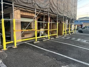 営業しながらの塗り替え工事となるので、足場工事や高圧洗浄などお客様の出入りがあると危険な作業は定休日に行うことに決め、工事をスタートいたします