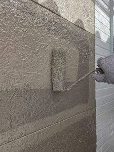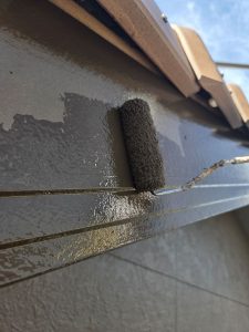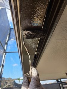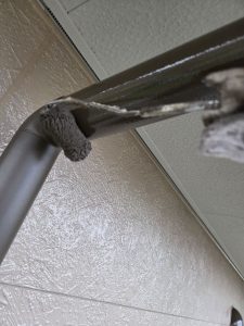 タテ樋や水切など、今まで白かった部分も全体のバランスをまとめるためにこげ茶色に塗装していきます